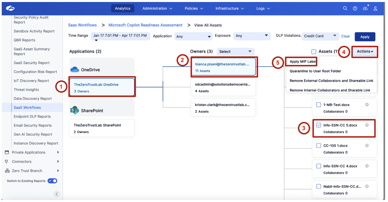 Select one or more assets and review the available remediation options. Example action: Apply MPIP label.