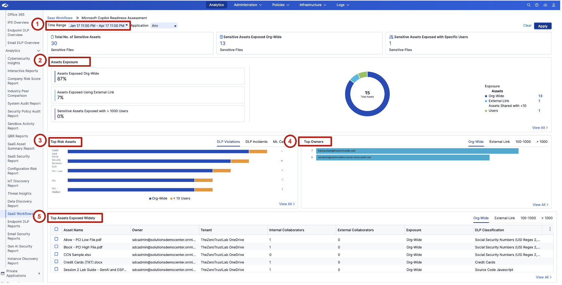 Review the Top Owners widget. Focus on the Org-Wide tab first. Observe which users are associated with the most exposed sensitive assets and consider whether the sharing pattern looks intentional, excessive, or risky.