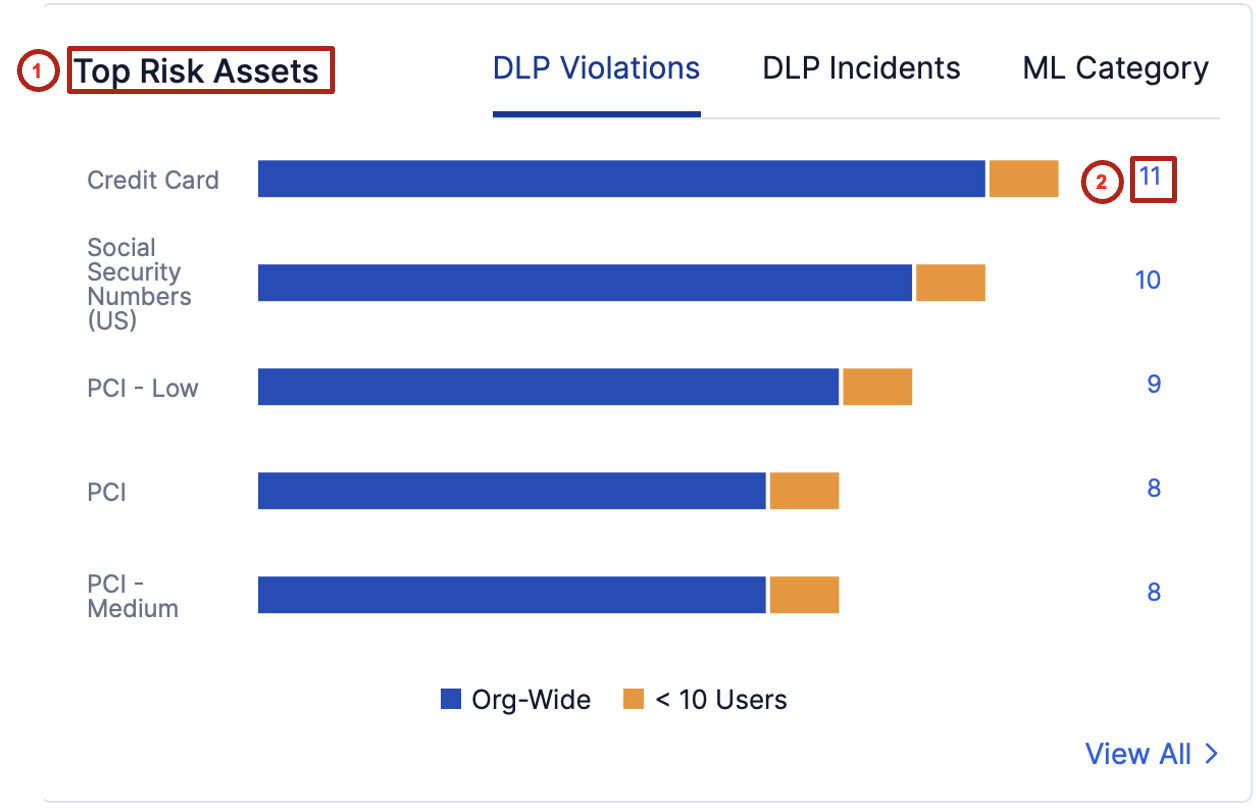 In the Top Risk Assets widget, click the data type with the highest count (for example, Credit Card).