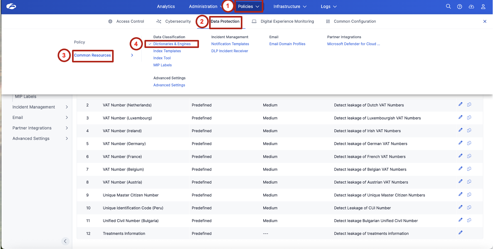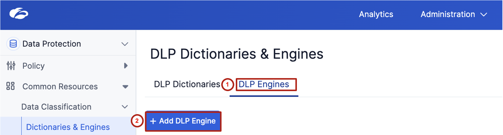 Policies → Data Protection → Common Resources → Dictionaries & Engines