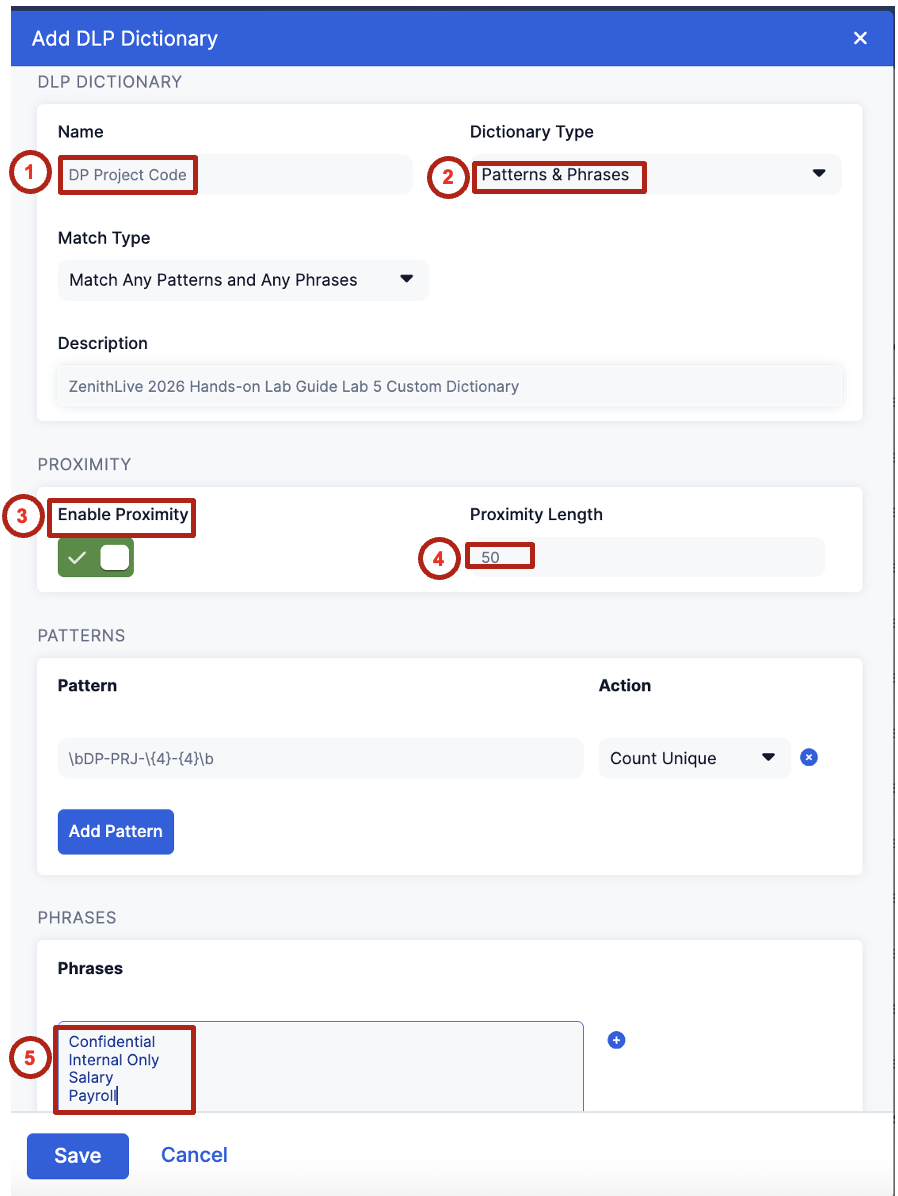 Dependency: The DLP dictionary and engine created in this lab are referenced in Labs 6, 7, and 8. Complete all steps before moving to the next lab.